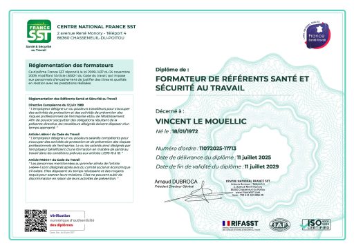 2025-Obtention du diplôme FORMATEUR DE RÉFÉRENTS SANTÉ ET SÉCURITÉ AU TRAVAIL LinkedInTwitterWhatsAppFacebook 5 février 2026 Cet article vous a plu ? Partagez le ... LinkedInTwitterWhatsAppFacebook Dans la même catégorie 2025- Obtention du diplôme Auditeur / Rédacteur de DUER 05 Fév 2026 2025-Obtention du diplôme FORMATEUR DE RÉFÉRENTS SANTÉ ET SÉ ... Articles récents 2025-Obtention du diplôme FORMATEUR DE RÉFÉRENTS SANTÉ ET SÉ ... 2025- Obtention du diplôme Auditeur / Rédacteur de DUER